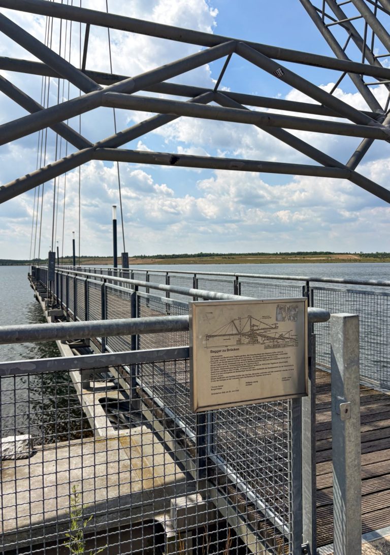 Auch landschaftsplanerisch wurden Akzente gesetzt, um Geschichte und Zukunft der Stadt zu verbinden. Entlang des Ufers entstand die Allee der Steine, ein inszenierter Fußweg, der mit Findlingen und Steinarrangements die Bergbaugeschichte symbolhaft nacherzählt. Ein besonderes Wahrzeichen stellt die Seebrücke dar. Hierbei handelt es sich um den 66 Meter langen Stahl-Abwurfausleger eines ehemaligen Tagebaugeräts, der als Aussichtsplattform aufgestellt wurde. Dieses Industrierequisit ragt heute als markante Brücke vom Ufer in den See.